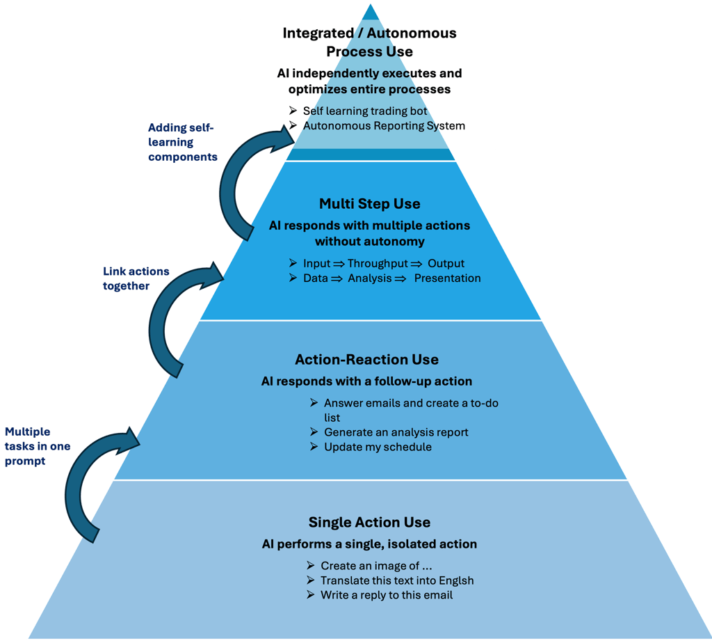 Veel organisaties denken dat ze “AI inzetten”, terwijl ze in feite blijven steken in level 1 of level 2. Pas bij level 3 en vooral level 4 komt het echte productiviteits- en innovatiewinst naar boven: