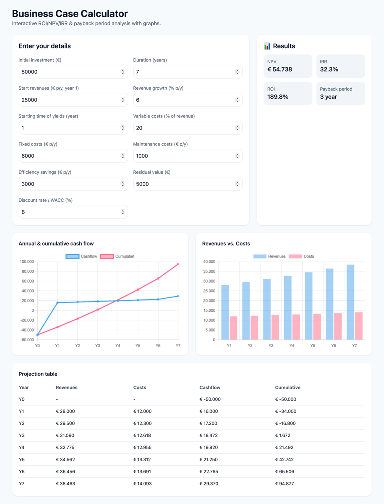 💡 Tip: use the calculator to test different scenarios (e.g., optimistic, realistic, conservative) and back up your decisions with data.